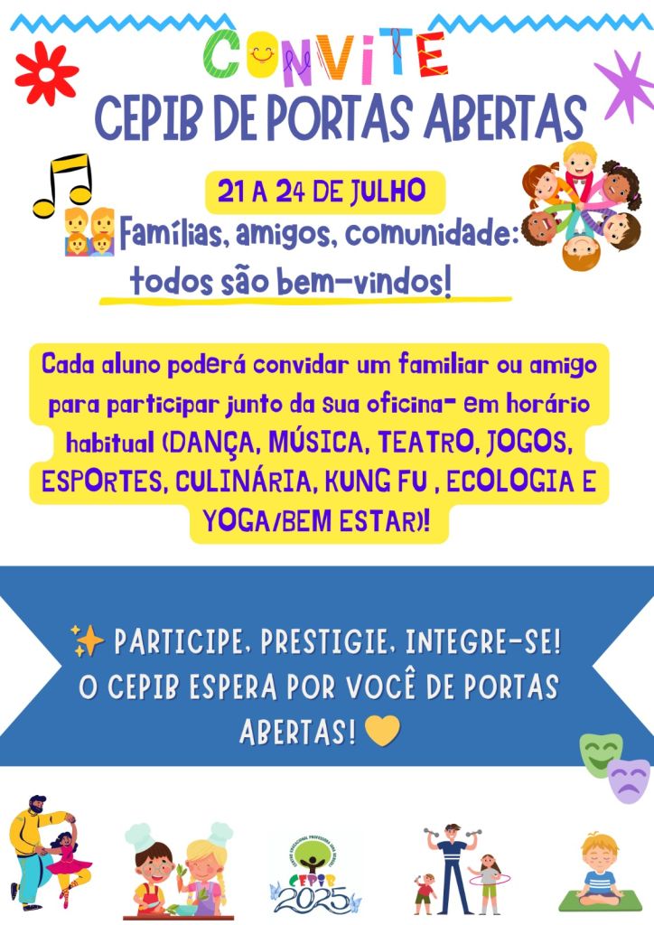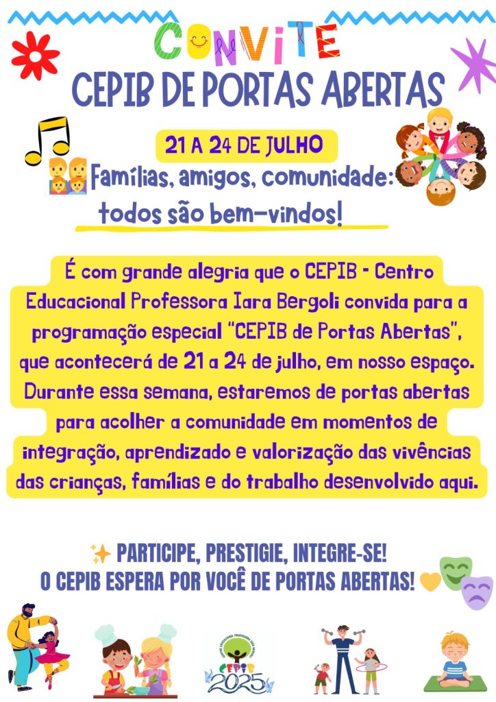 O Centro Educacional Professora Iara Bergoli (CEPIB) realiza, de 21 a 24 de julho, a programação “CEPIB de Portas Abertas”, com o objetivo de aproximar a comunidade do espaço escolar e dar visibilidade ao trabalho desenvolvido com os alunos.