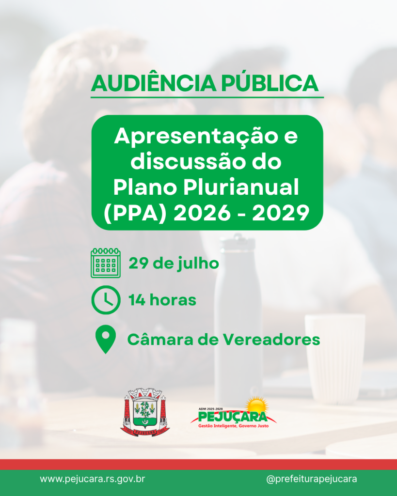 A Administração Municipal, por meio da Secretaria de Administração, torna público a realização de Audiência Pública para a apresentação e discussão do Plano Plurianual 2026-2029, que irá ocorrer no dia 29 de julho de 2025, às 14 horas, na Câmara de Vereadores de Pejuçara.