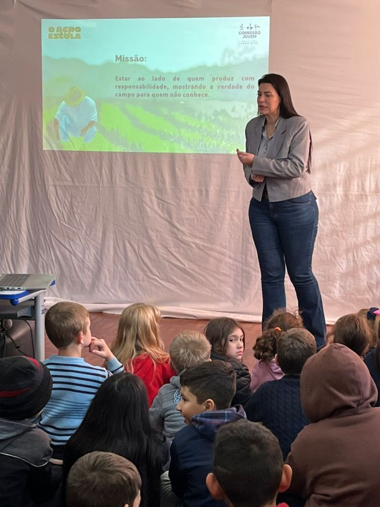 Na manhã desta quarta-feira, 6, os alunos da Escola Municipal Pejuçara participaram da palestra “O Agro Vai à Escola”, promovida pela Comissão Jovem do Sindicato Rural de Cruz Alta, com o apoio da FARSUL – Federação da Agricultura do Estado do Rio Grande do Sul.