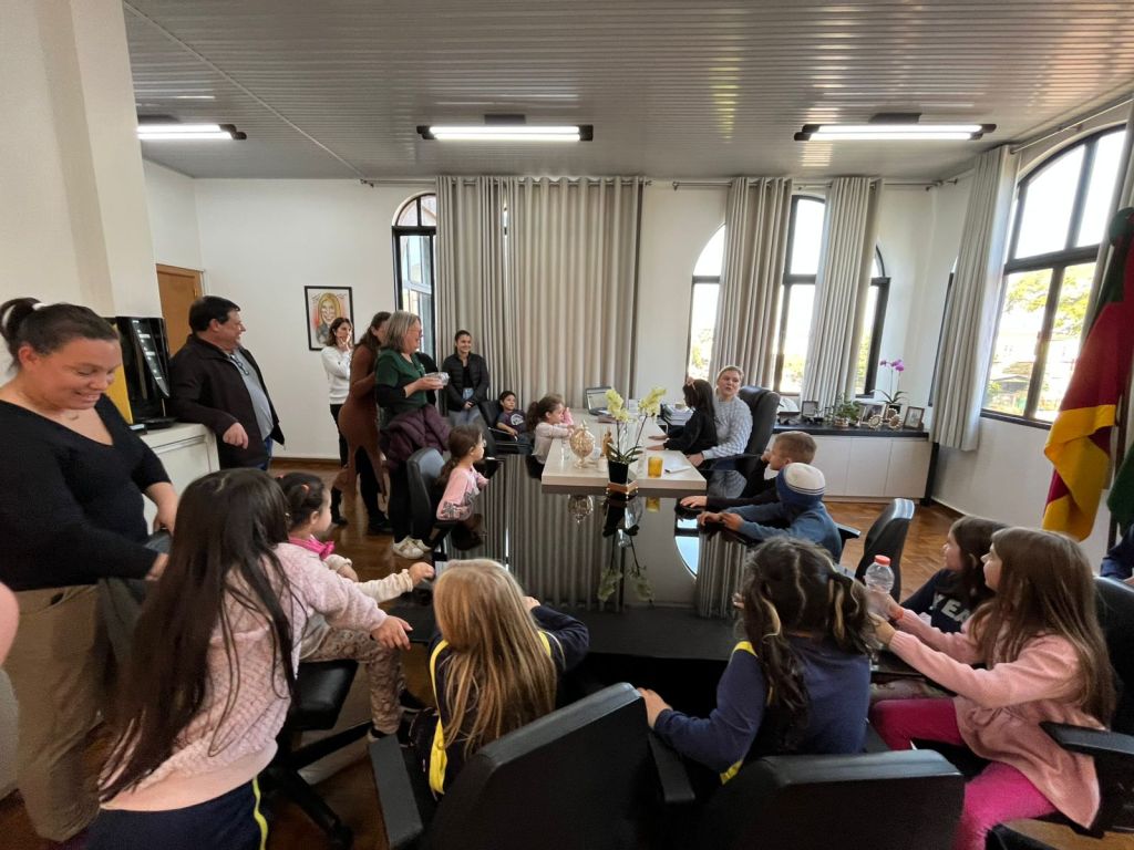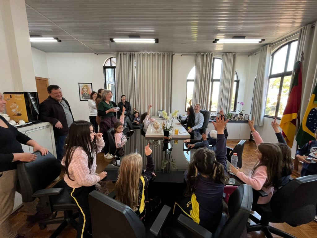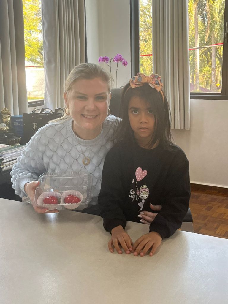 Na tarde desta quarta-feira (13), alunos do 1º e 2º ano do turno integral da Escola Municipal Pejuçara visitaram o gabinete da prefeita Flaviana Brandemburg Basso, levando o “Morango do Amor”, resultado de uma oficina culinária realizada pela professora Camila Mantovani no CEPIB. Os morangos utilizados foram doados pela Granja Bonini.