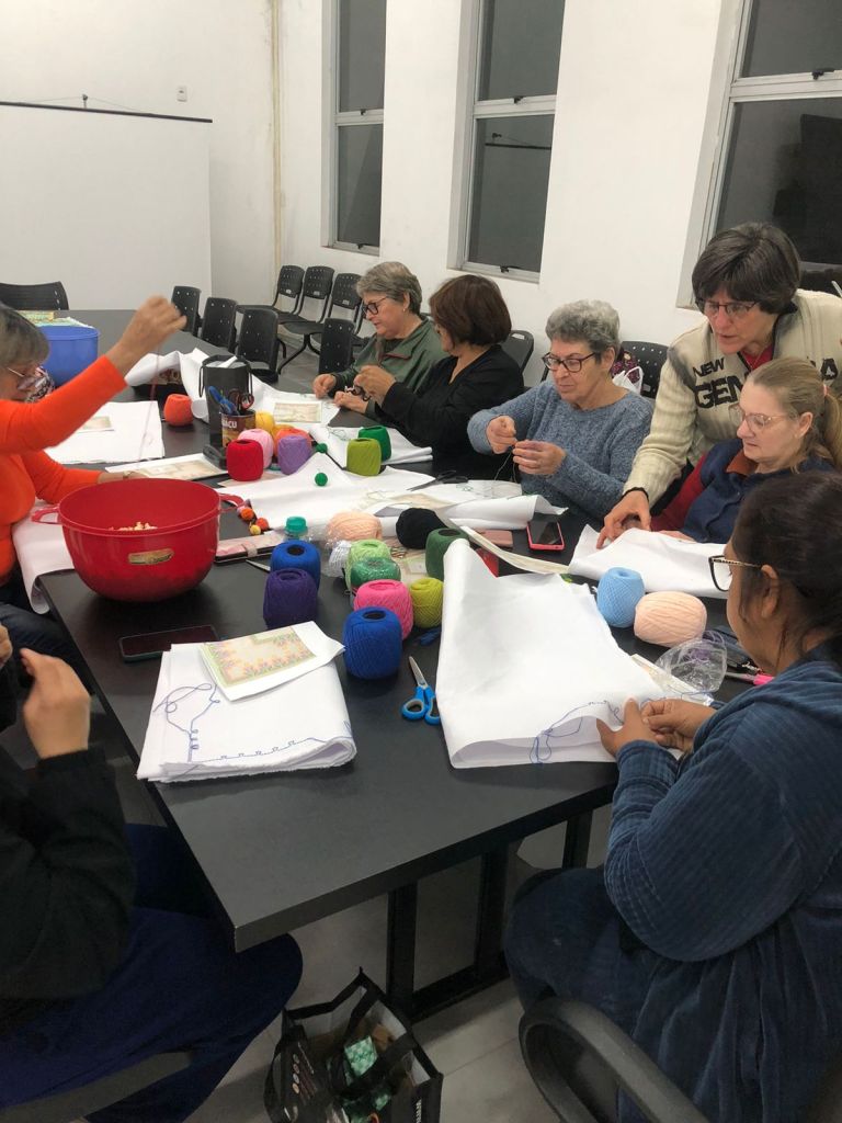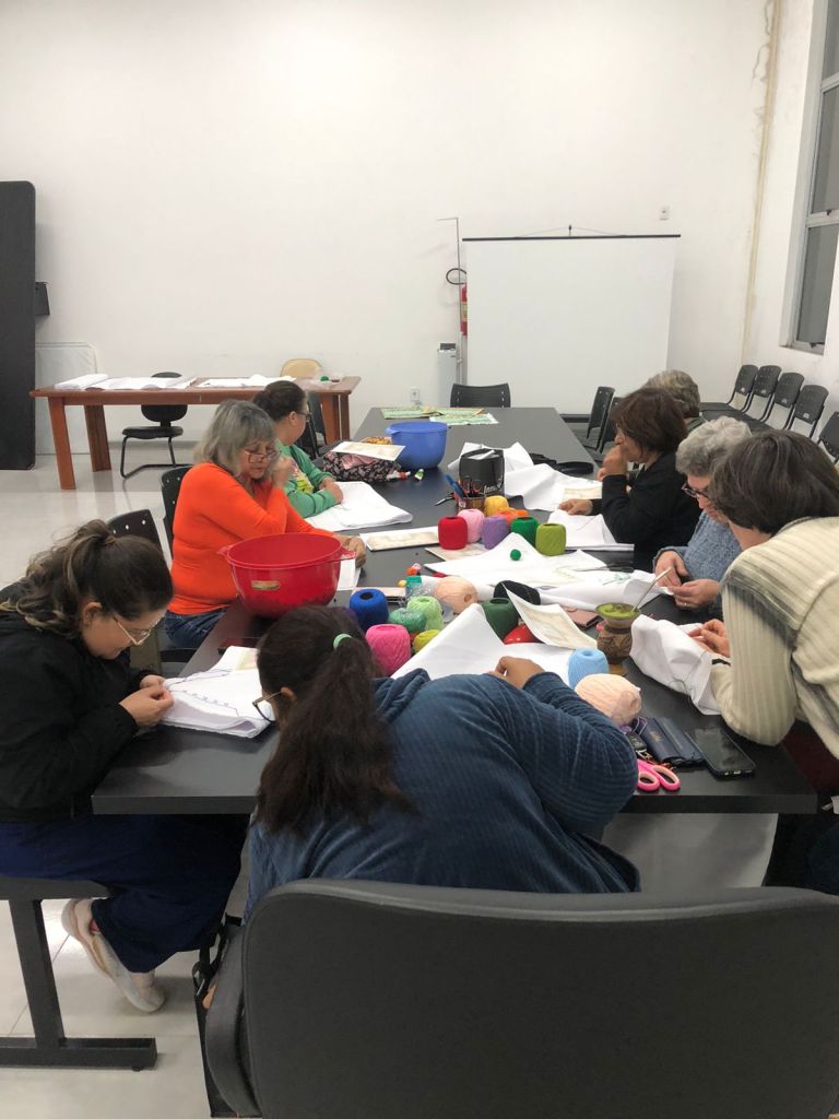 Na noite de quarta-feira (13), o grupo Psicoterapia 1 esteve reunido no anexo da Secretaria de Saúde, iniciando um trabalho de confecção de trilhos com bordado de vagonite no tecido de etamine. As participantes levaram seus trabalhos para casa para continuar a produção e apresentar o progresso no próximo encontro.