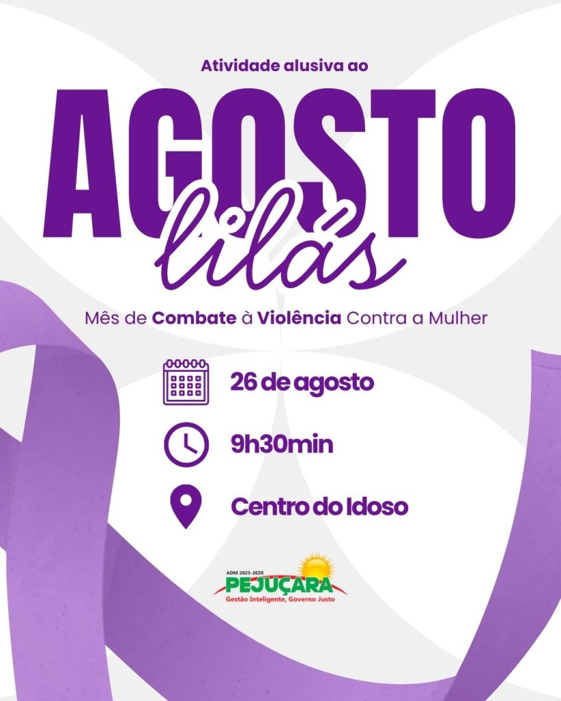 Em alusão ao Agosto Lilás, mês de conscientização e combate à violência contra a mulher, a comunidade está convidada para um momento de reflexão no Centro do Idoso, no dia 26 de agosto, às 9h30.