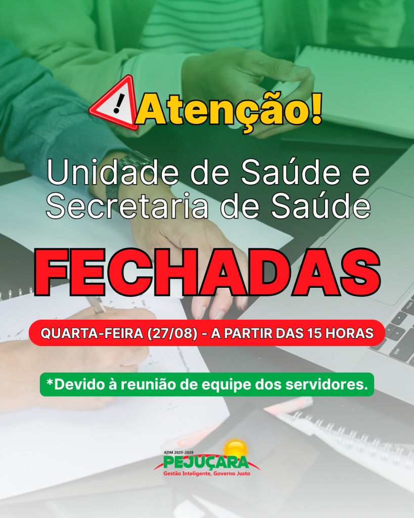 A Secretaria Municipal de Saúde informa que, na quarta-feira, 27 de agosto, a partir das 15 horas, tanto a Secretaria quanto a Unidade Básica de Saúde estarão fechadas em razão de reunião interna com os servidores. Agradecemos a compreensão de todos.