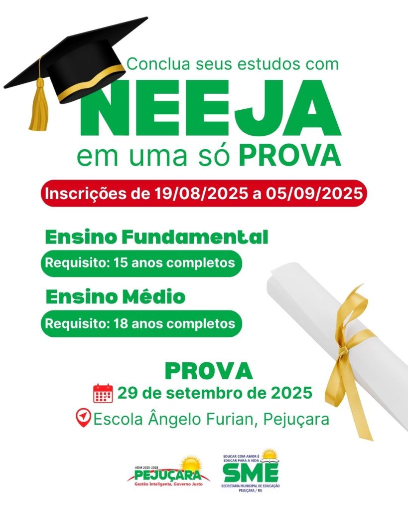 A Secretaria Municipal de Educação informa que estão abertas, de 19 de agosto a 5 de setembro de 2025, as inscrições para a Prova Unificada do NEEJA – Érico Veríssimo (9ª CRE), destinada à conclusão do Ensino Fundamental e Médio.
