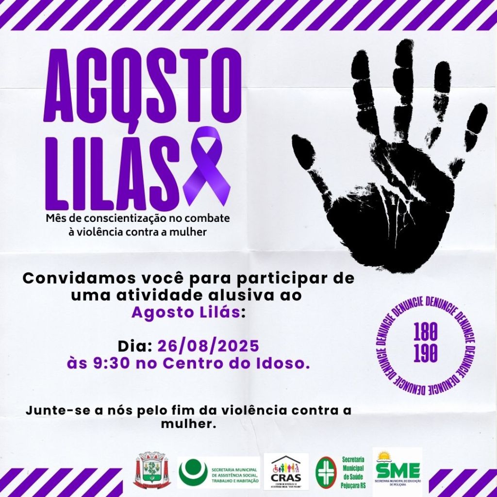 Em alusão ao Agosto Lilás, mês de conscientização e combate à violência contra a mulher, a comunidade está convidada para um momento de reflexão no Centro do Idoso, amanhã, 26 de agosto, às 9h30.