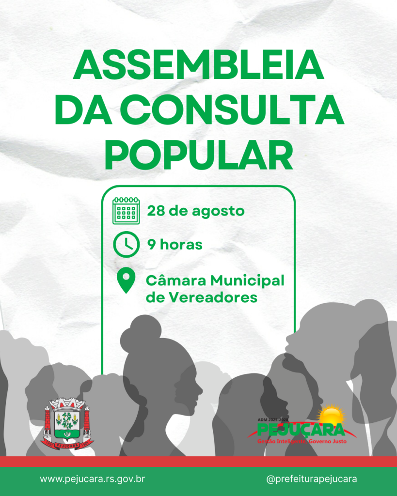 A Administração Municipal, por meio do Conselho Municipal de Desenvolvimento (COMUDE), presidido por Luis Afonso Mollmann dos Santos, convida a comunidade para participar da Assembleia da Consulta Popular, que será realizada no dia 28 de agosto de 2025, às 9h, na Câmara de Vereadores.