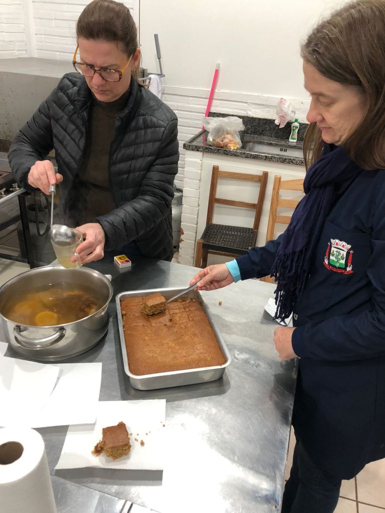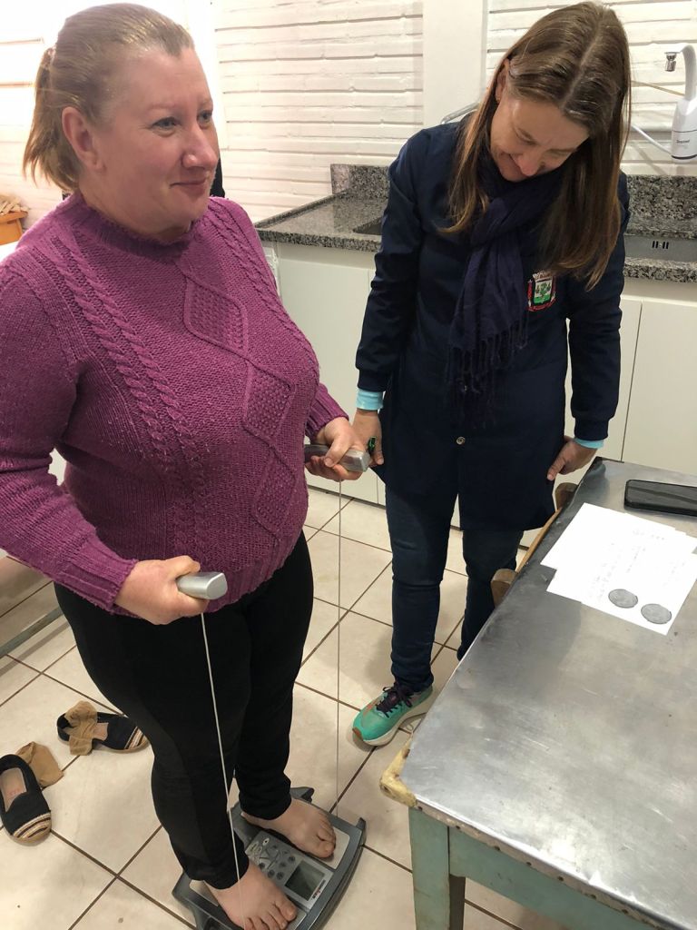 A nutricionista conduziu orientações sobre alimentação saudável, realizou avaliação de bioimpedância com os participantes e preparou um bolo de aveia com banana e amendoim, reforçando a importância de hábitos alimentares equilibrados no dia a dia.