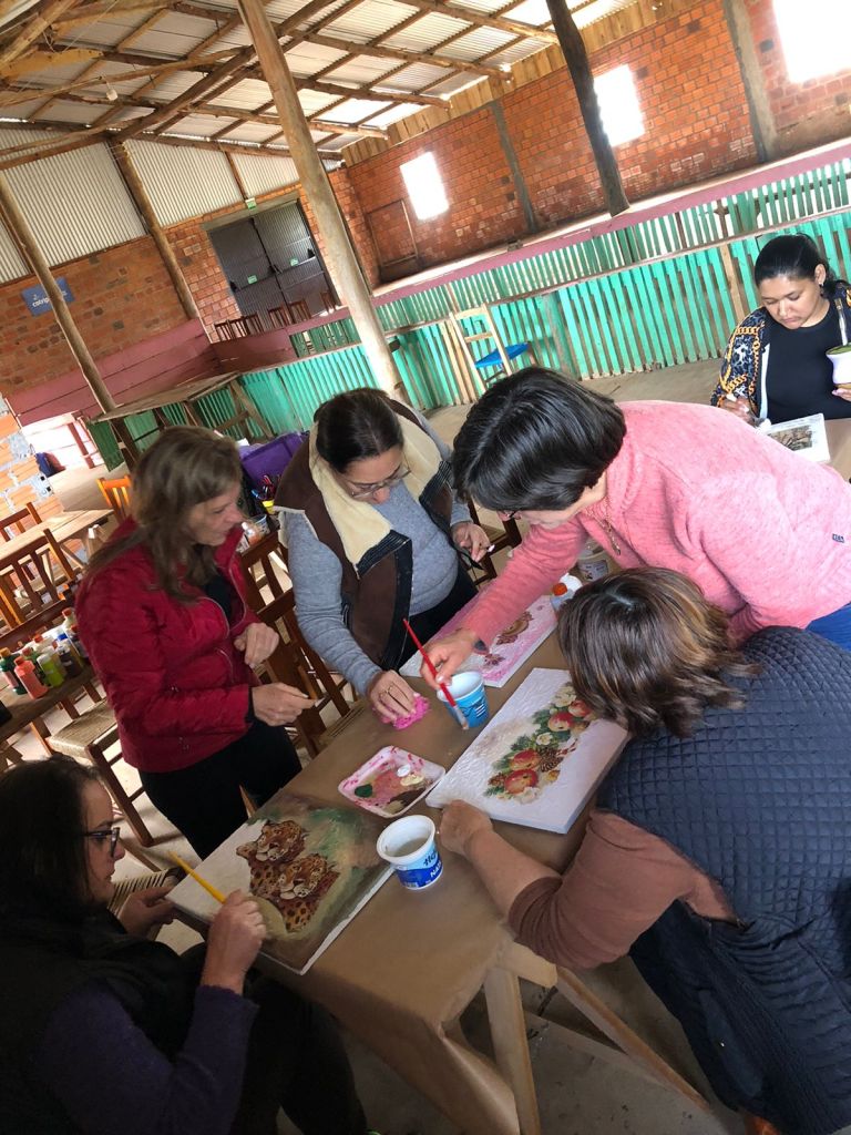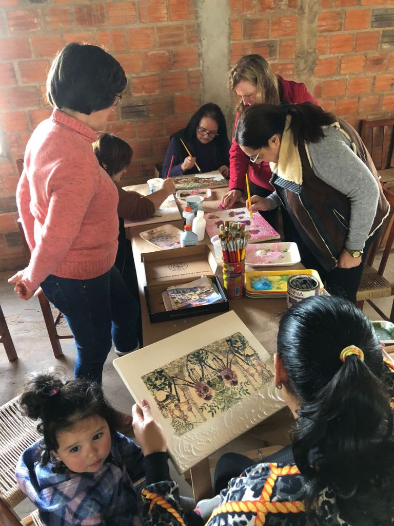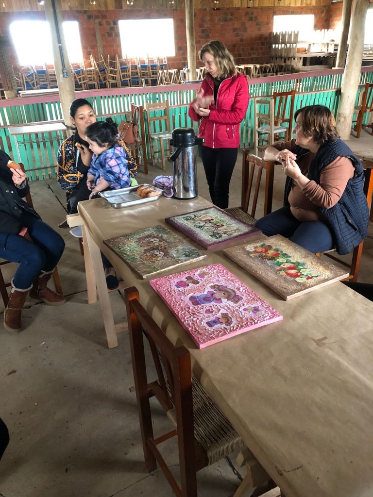 Na tarde de terça-feira, 26, o grupo do NAAB, em parceria com a Emater, esteve reunido na localidade de Passo do Inglês, dando continuidade às atividades iniciadas no encontro anterior, e alguns participantes finalizaram a tela com pintura e aplicação de verniz, consolidando o trabalho iniciado anteriormente. A atividade ocorreu sob coordenação da psicóloga Tábata Darui, da Secretaria de Saúde, com apoio da oficineira Clarice Villani e da extensionista Loiva Schröer, da Emater.
