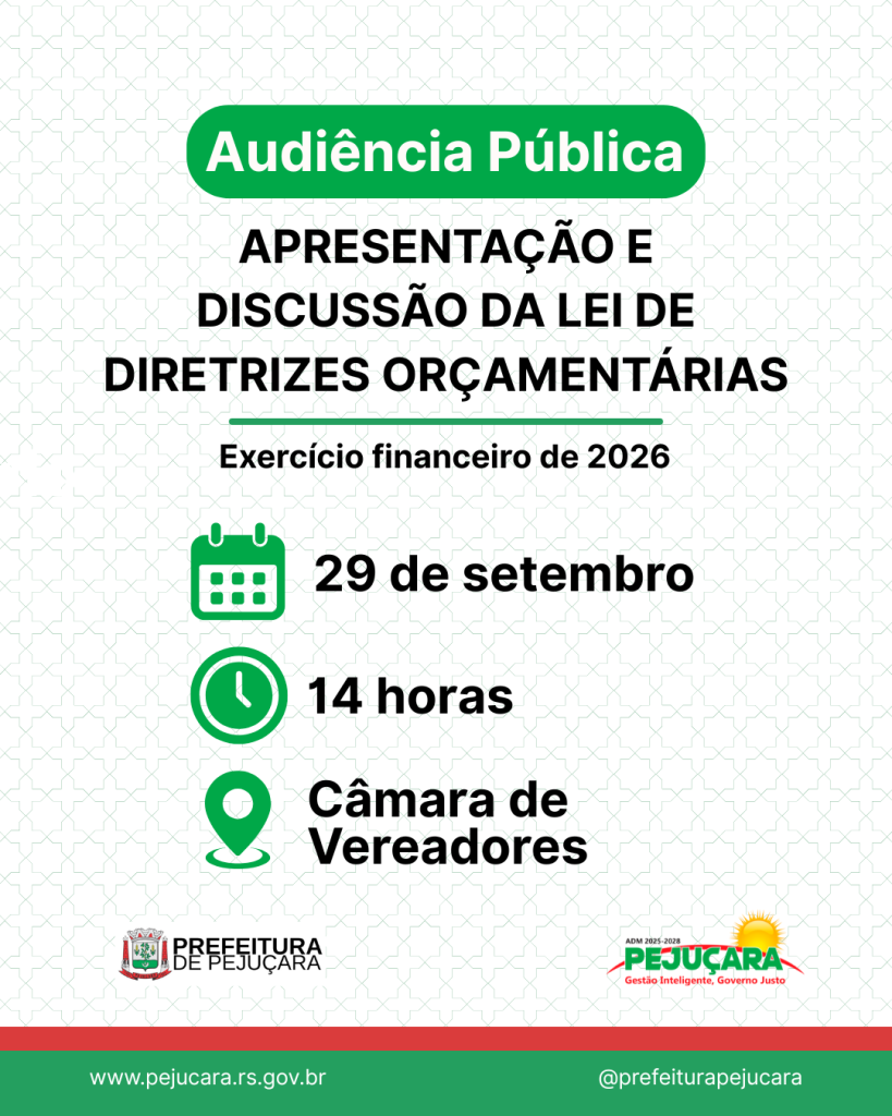A Administração Municipal informa e convida toda a população para participar, no dia 29 de setembro, às 14 horas, no Plenário da Câmara de Vereadores, da Audiência Pública para apresentação e discussão da Lei de Diretrizes Orçamentárias (LDO), para o exercício financeiro de 2026.
