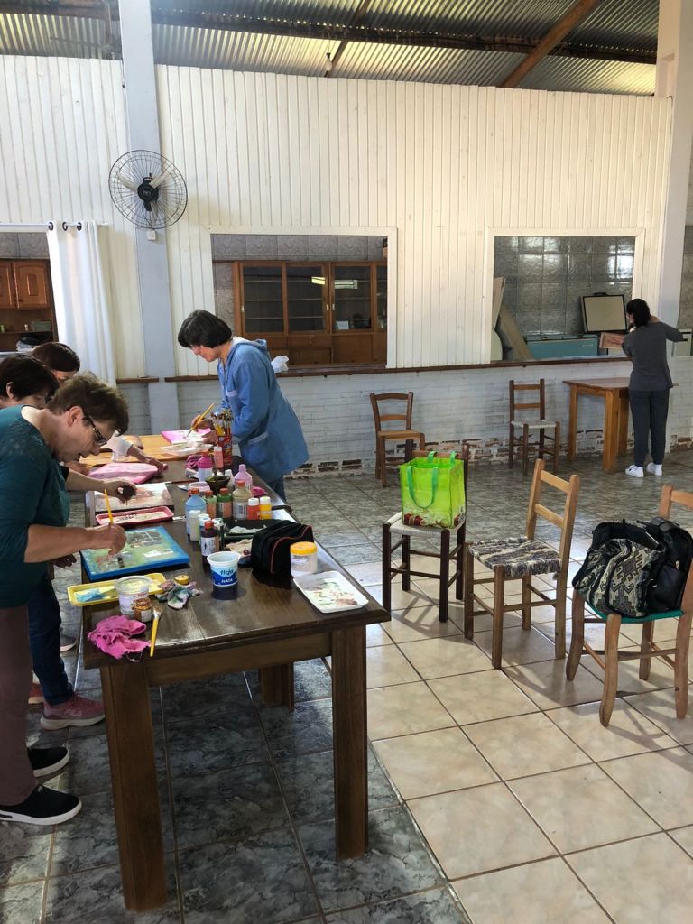 Na tarde de ontem, quinta-feira, 25, o grupo do NAAB, em parceria com a Emater, realizou na comunidade de Santo Antônio a finalização das telas, com a pintura de acabamento dos trabalhos. A atividade teve como objetivo estimular a coordenação motora, a atenção, a concentração e a socialização, além de fortalecer os vínculos por meio da ajuda mútua entre as participantes.