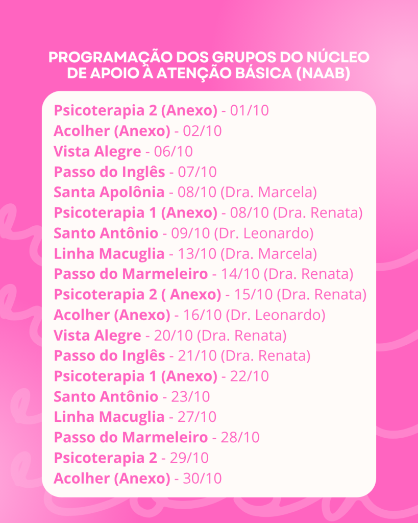 Confira a programação do Outubro Rosa com os grupos do Núcleo de Apoio à Atenção Básica (NAAB)