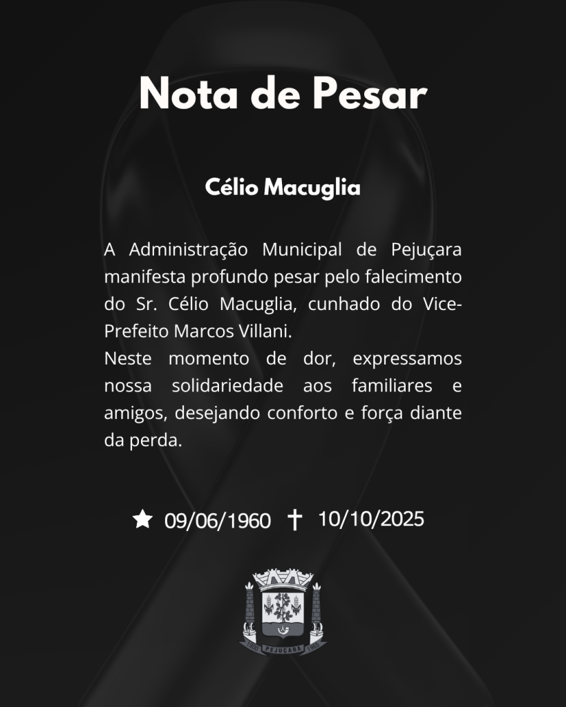 A Administração Municipal de Pejuçara manifesta profundo pesar pelo falecimento do Sr. Célio Macuglia, cunhado do Vice-Prefeito Marcos Villani.