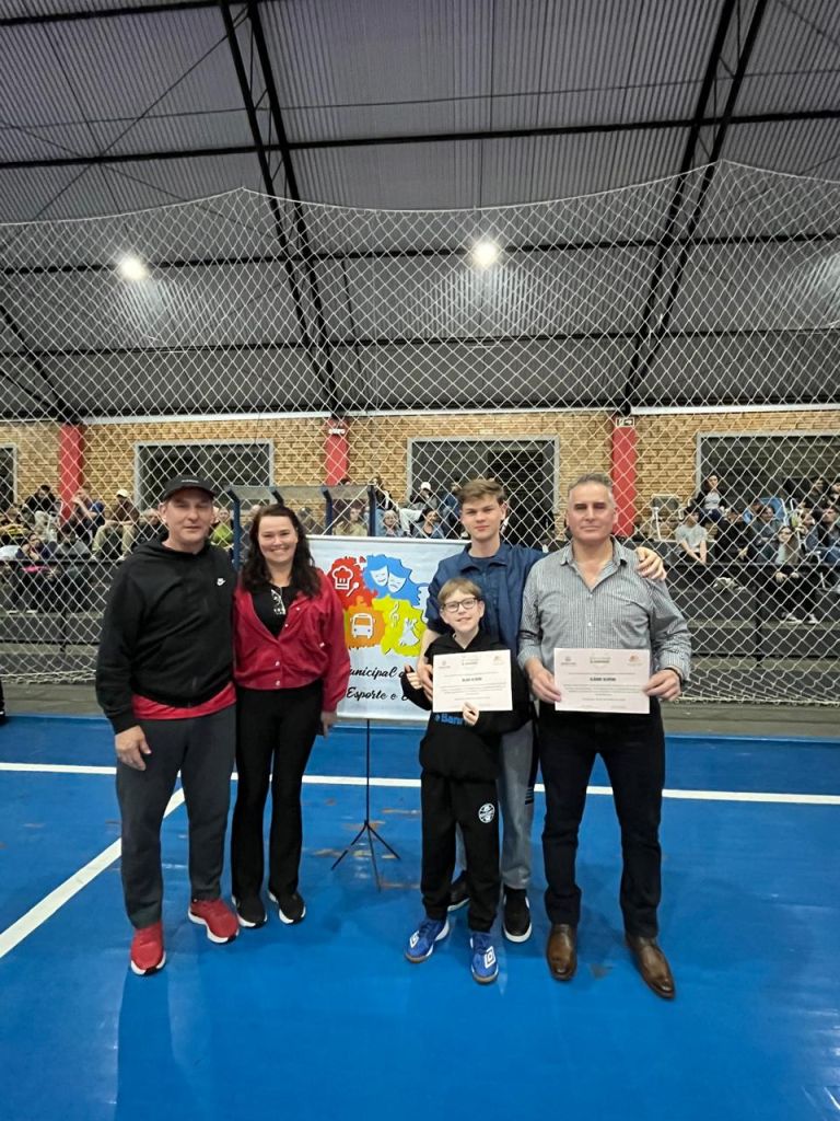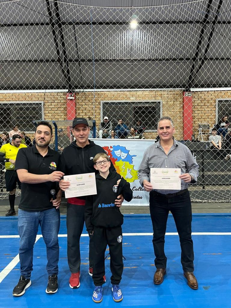 Nesta etapa, os homenageados foram Cláudio e Dejair Oliveira, reconhecidos por sua trajetória marcante no futsal local e pela contribuição do esporte no município.