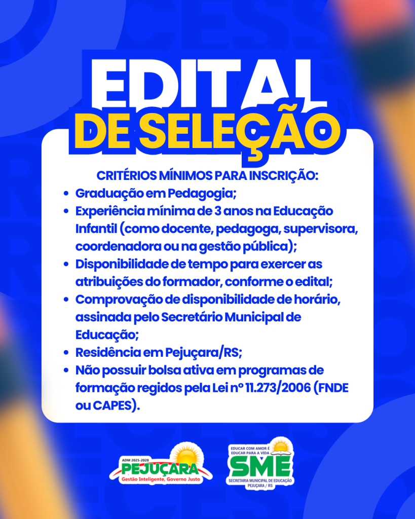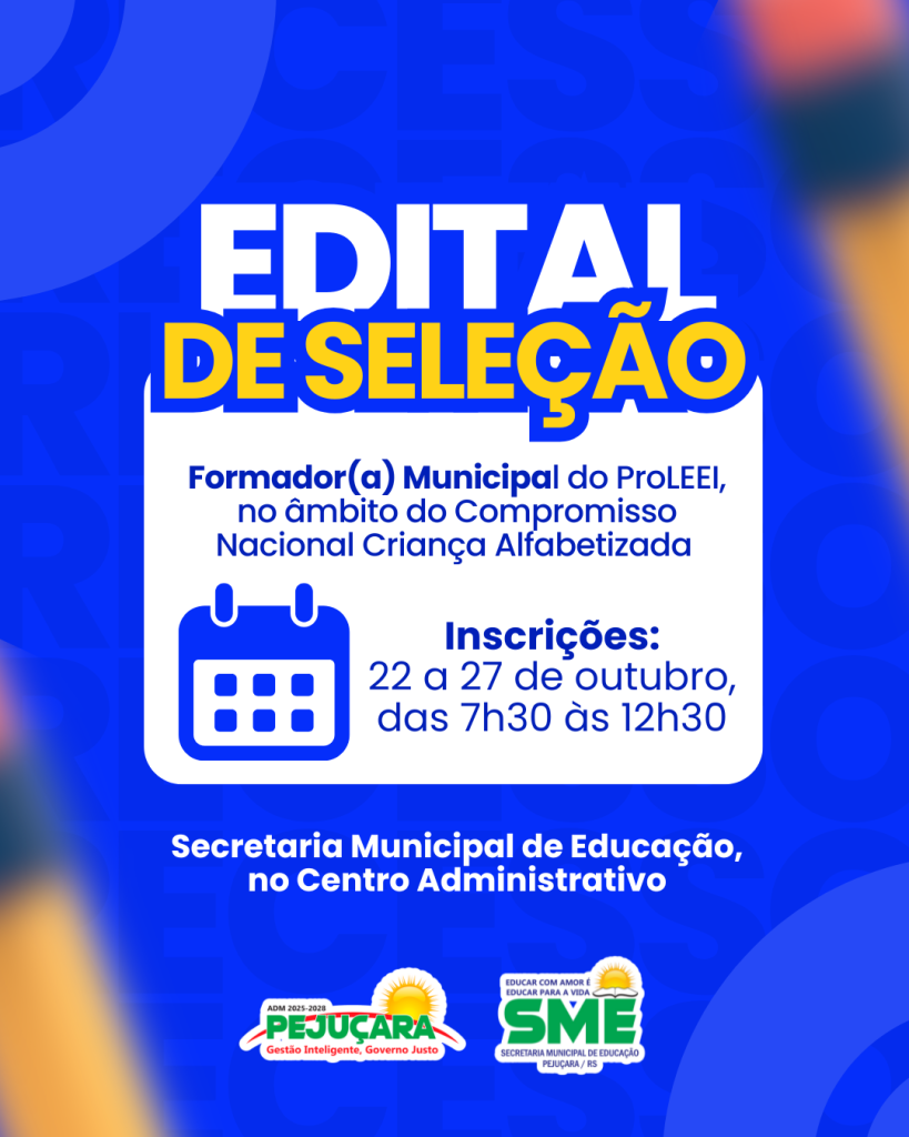 A Secretaria Municipal de Educação informa que estarão abertas, de 22 a 27 de outubro, as inscrições para o processo seletivo destinado à função de Formador(a) Municipal do ProLEEI, no âmbito do Compromisso Nacional Criança Alfabetizada, conforme a Lei nº 11.273/2006, a Resolução nº 10/2025 e o Caderno de Orientações da Região Sul do ProLEEI 2025/2026.