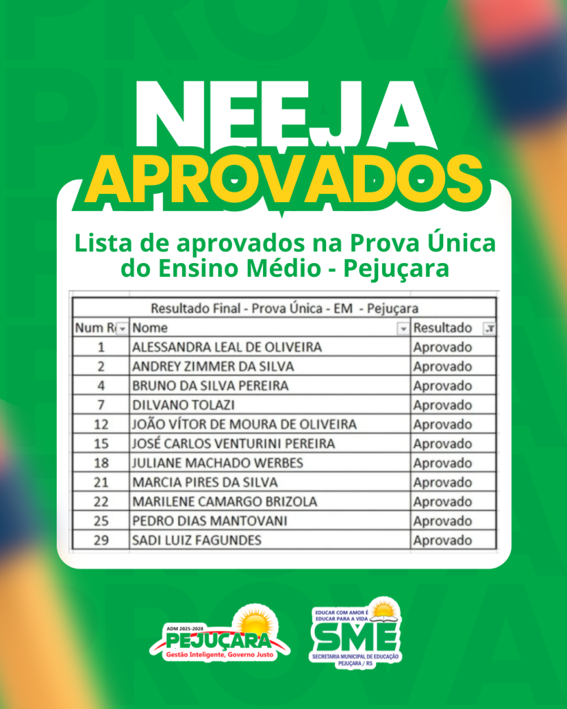 Confira a lista de aprovados na Prova Única do Ensino Médio do município de Pejuçara, divulgada pela 9ª Coordenadoria Regional de Educação em parceria com o NEEJA Érico Veríssimo.