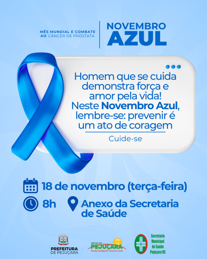 A Administração Municipal, por meio da Secretaria Municipal de Saúde, convida os homens do Centro Administrativo e da Secretaria Municipal de Saúde para um encontro especial em alusão ao Novembro Azul, mês de prevenção e combate ao câncer de próstata.
