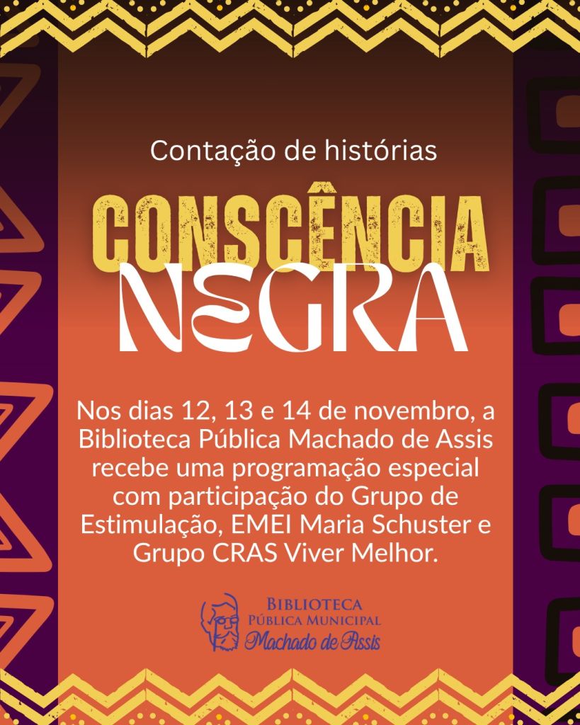 Nos dias 12, 13 e 14 de novembro, a Biblioteca Pública Machado de Assis promove atividades especiais de contação de história sobre a consciência negra, com participação do Grupo de Estimulação, EMEI Maria Schuster e Grupo CRAS Viver Melhor.