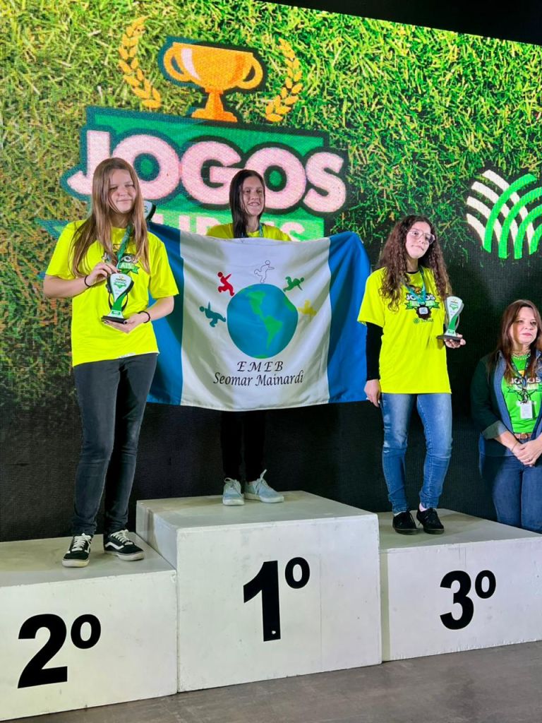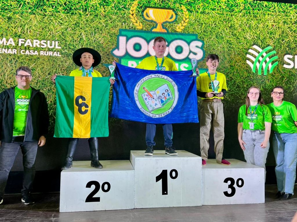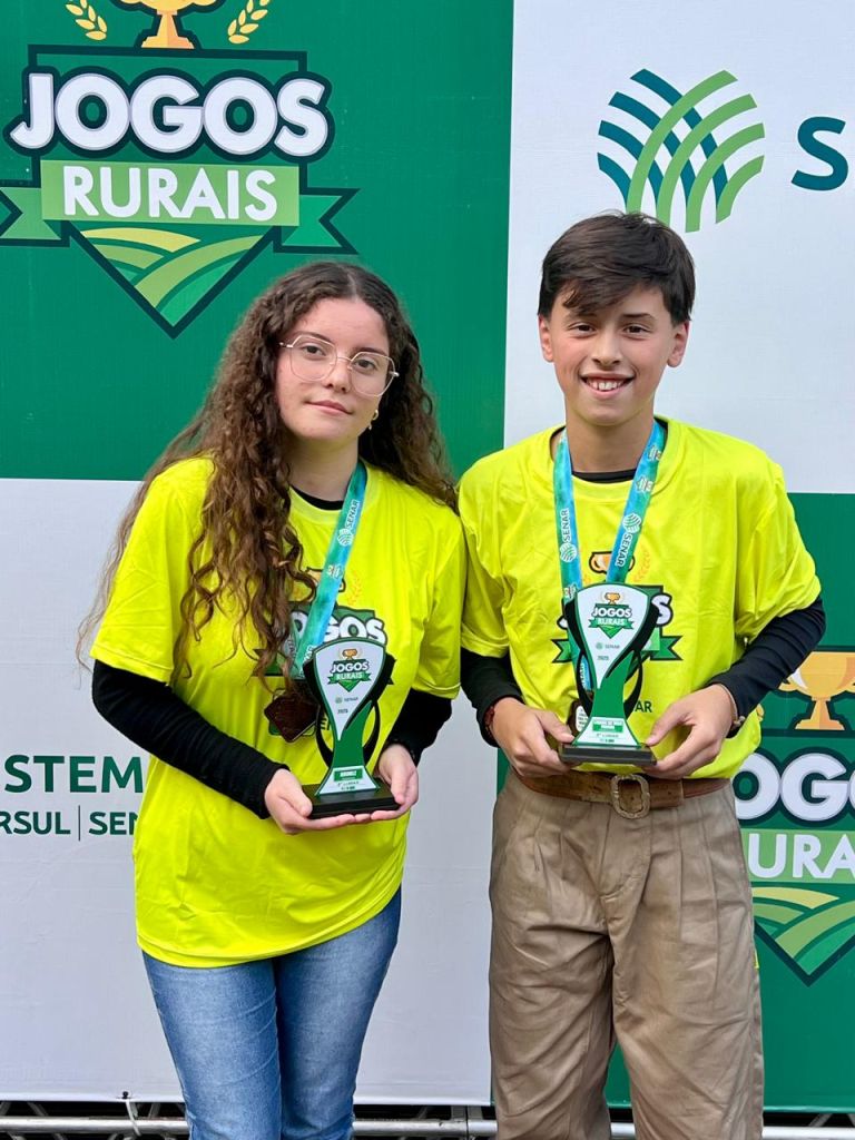 A Escola Municipal Pejuçara foi destaque na etapa estadual dos Jogos Rurais do Senar, realizada em 8 de novembro, em Porto Alegre. O aluno Conrado Mioso Siqueira conquistou o 3º lugar na prova de laçada de vaca parada, enquanto Paola de Jesus da Luz alcançou o 3º lugar estadual na modalidade de xadrez.