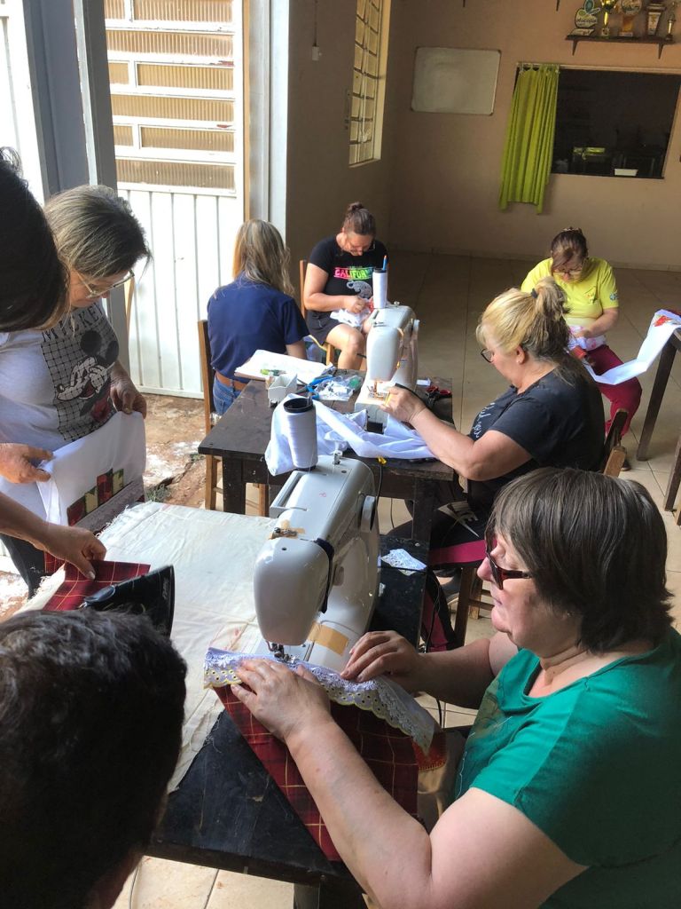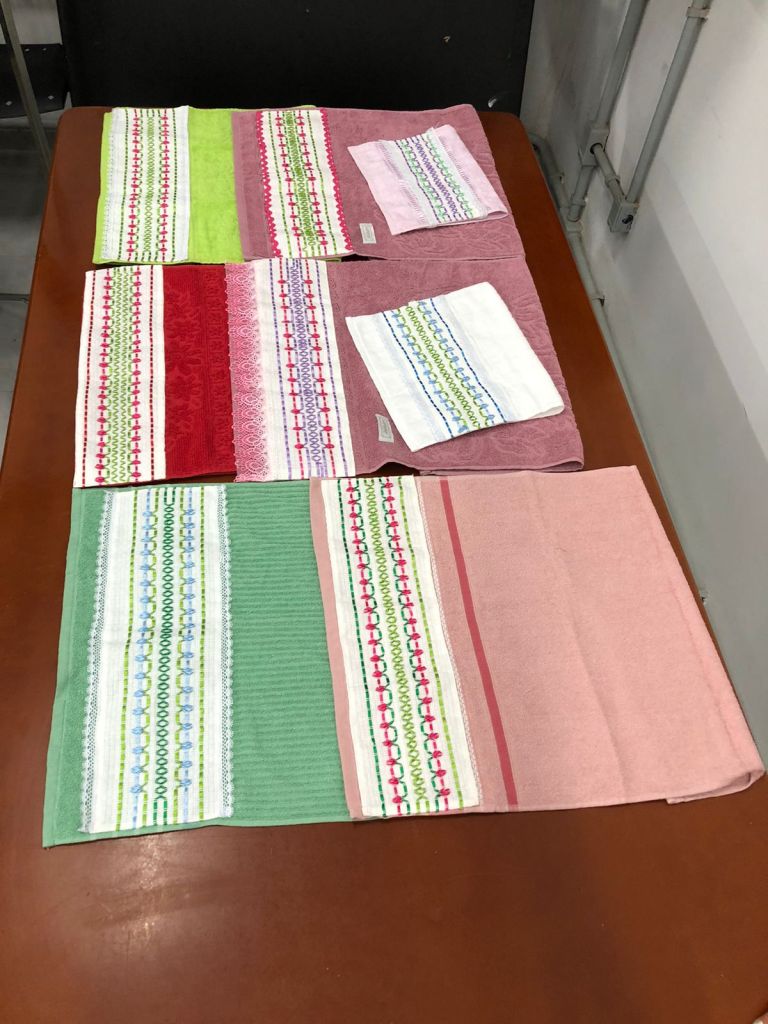 Durante os encontros, foram produzidas toalhas de rosto com pintura à mão e trilhos de mesa em patchwork.