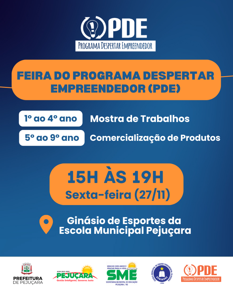 A Escola Municipal Pejuçara convida a comunidade para prestigiar a Mostra e Feira do Programa Despertar Empreendedor (PDE), que será realizada no dia 27 de novembro, das 15h às 19h.