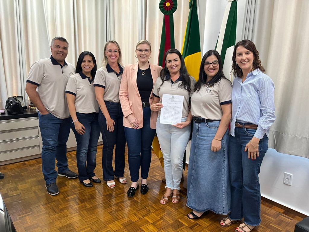 A cerimônia ocorreu no Gabinete Municipal, com a presença da Prefeita Flaviana Brandemburg Basso, da Secretária de Educação, Emanueli Basso Quaini, e dos profissionais que integram as equipes diretivas de cada escola.