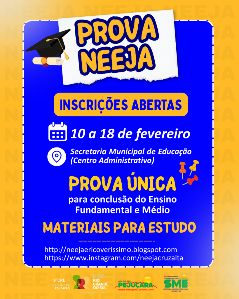 A Secretaria Municipal de Educação informa que as inscrições para a Prova Unificada do NEEJA – Érico Veríssimo (9ª CRE) acontecem no período de 10 a 18 de fevereiro, destinadas à conclusão do Ensino Fundamental e do Ensino Médio. O edital com todas as informações está disponível para consulta no site oficial da Prefeitura.