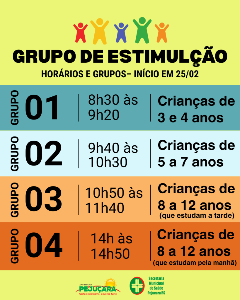 A Secretaria Municipal de Saúde informa que o Grupo de Estimulação terá início no dia 25 de fevereiro, conforme a organização das turmas e horários abaixo: