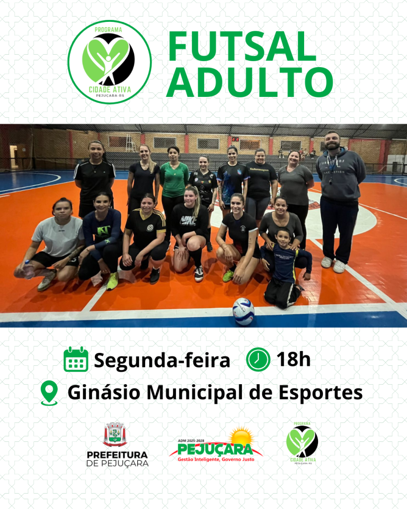 O futsal adulto está disponível para a comunidade no Ginásio Municipal de Esportes, com encontros realizados todas as segundas-feiras, às 18h. Uma prática esportiva que estimula o condicionamento físico, fortalece o corpo e contribui para a qualidade de vida,