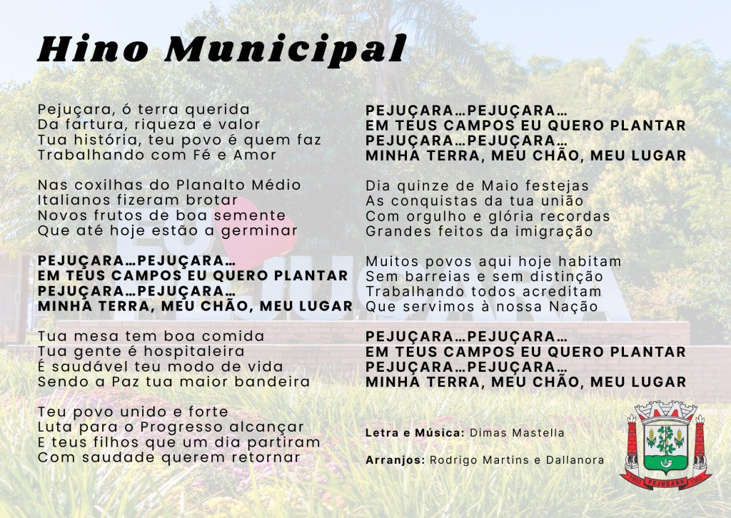 Hino Municipal: exalta a identidade de Pejuçara, preservando a herança italiana dos colonizadores e o valor da união, do trabalho e da fé que moldaram o desenvolvimento do município.
