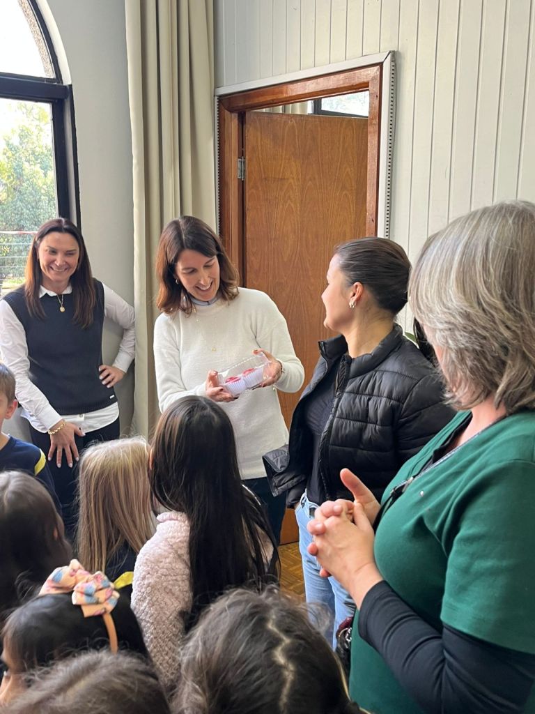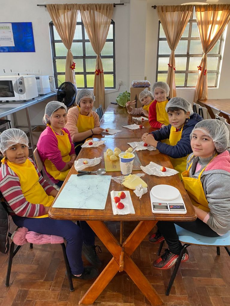 Na tarde desta quarta-feira (13), alunos do 1º e 2º ano do turno integral da Escola Municipal Pejuçara visitaram o gabinete da prefeita Flaviana Brandemburg Basso, levando o “Morango do Amor”, resultado de uma oficina culinária realizada pela professora Camila Mantovani no CEPIB. Os morangos utilizados foram doados pela Granja Bonini.