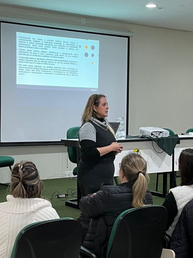 A atividade contou com a Assessora Pedagógica do Sistema Maxi de Ensino, Elisandra Gomes, que apresentou reflexões sobre o tema “Estimulação Essencial”, destacando práticas que favorecem o desenvolvimento infantil na primeira infância.