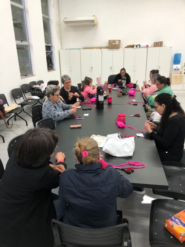 Durante o encontro, as participantes produziram corações em crochê, material que será posteriormente disponibilizado na Unidade de Saúde para as mulheres que realizarem exames preventivos. A atividade proporciona o desenvolvimento da coordenação motora fina e estimula a criatividade de cada integrante.