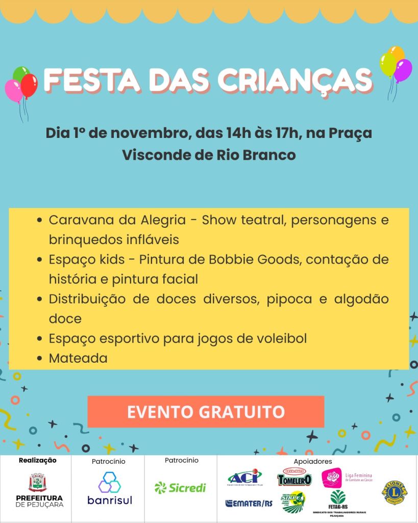 A diversão está garantida! Confira a programação especial da Festa das Crianças, no dia 1° de novembro, das 14h às 17h, na Praça Visconde de Rio Branco.