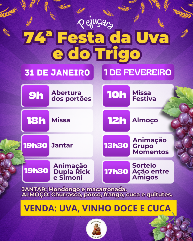 Tradição e história marcam mais uma edição da Festa da Uva e do Trigo em Pejuçara. Esperamos por você para celebrar a cultura, a gastronomia e a identidade do nosso município!
