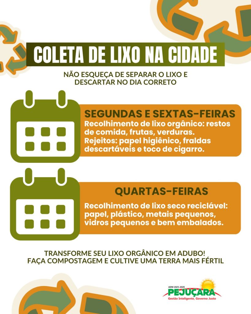 Segundas e sextas-feiras: Lixo orgânico e rejeitos; Quartas-feiras: lixo seco recitável