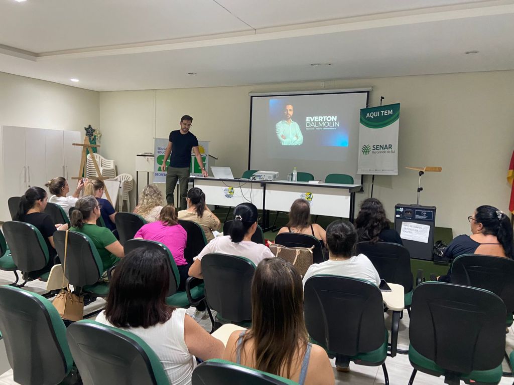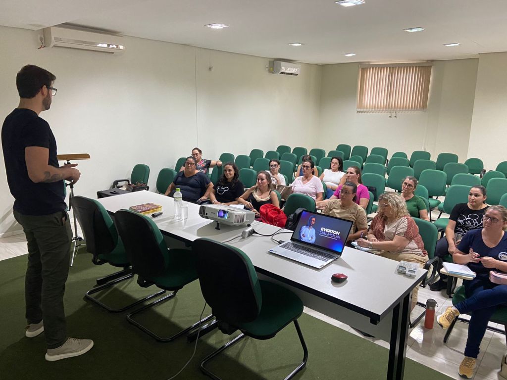 À tarde, a programação foi organizada por etapas. Professores da Educação Infantil participaram da formação sobre “PEI e Inventário Portage”, conduzida pelo psicólogo Everton Dal Molin, com foco no acompanhamento e avaliação do desenvolvimento infantil.
