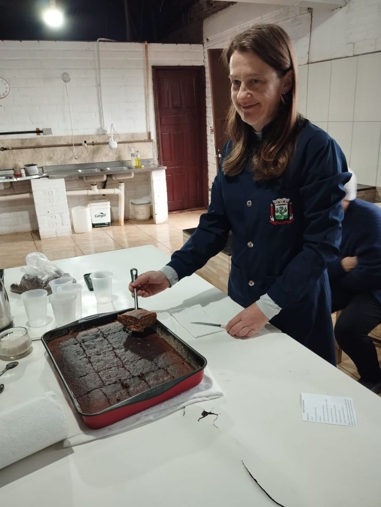 Durante a atividade, a nutricionista conduziu orientações sobre alimentação saudável, promoveu a avaliação de bioimpedância com as participantes e ainda preparou um bolo de aveia com banana e amendoim, proporcionando um momento de aprendizado prático.
