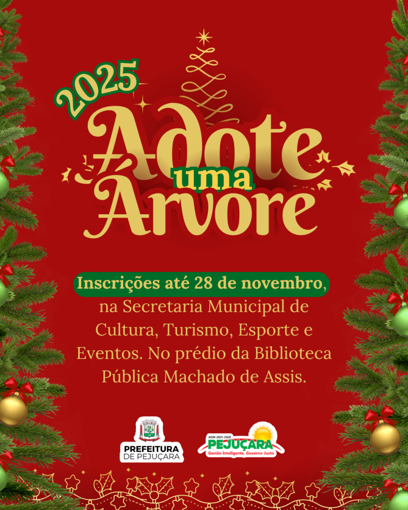A Administração Municipal convida empresas, entidades, escolas e a comunidade a participarem da decoração das árvores de Natal na Praça Central. As inscrições devem ser feitas na Secretaria Municipal de Cultura, Turismo, Esporte e Eventos, no prédio da Biblioteca Pública Machado de Assis, até o dia 28 de novembro.