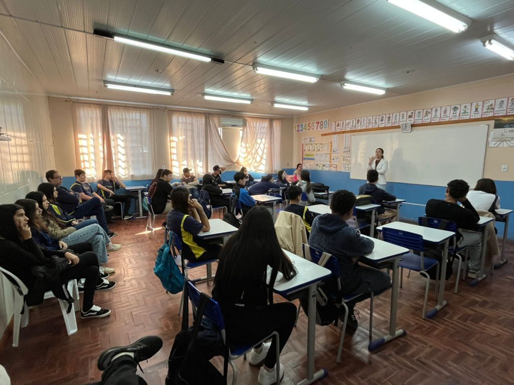 Na quarta-feira (22), os alunos do 9º ano da Escola Municipal Pejuçara participaram de um bate-papo com a professora Camilia V. Mioso sobre as avaliações do SAEB e do SAERS.
