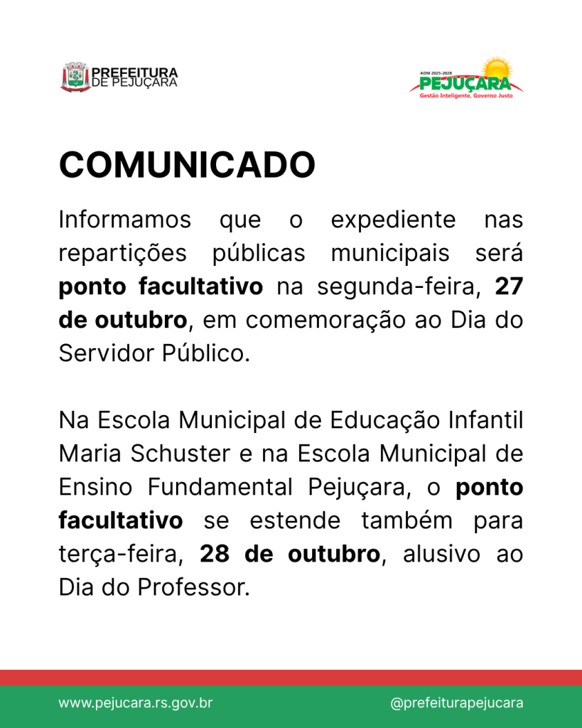 Na Escola Municipal de Educação Infantil Maria Schuster e na Escola Municipal de Ensino Fundamental Pejuçara, o ponto facultativo será nos dias 27 e 28 de outubro, abrangendo também a terça-feira em homenagem ao Dia do Professor.