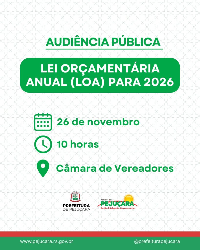 A Administração Municipal informa e convida toda a população para participar, no dia 26 de novembro, às 10 horas, no Plenário da Câmara de Vereadores, da Audiência Pública para apresentação e discussão da Lei Orçamentária Anual (LOA) para o exercício financeiro de 2026.
