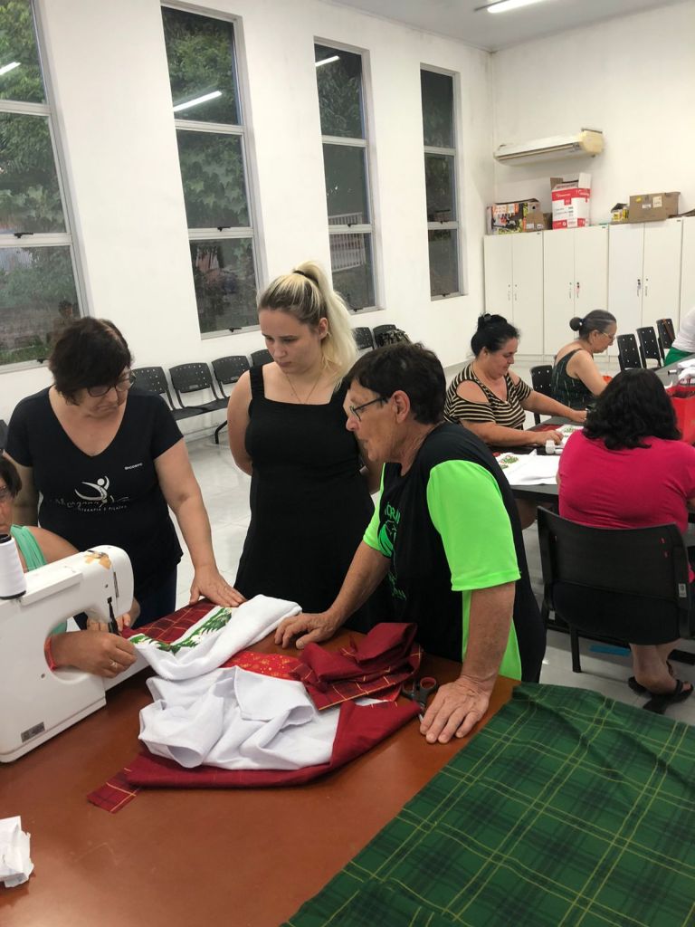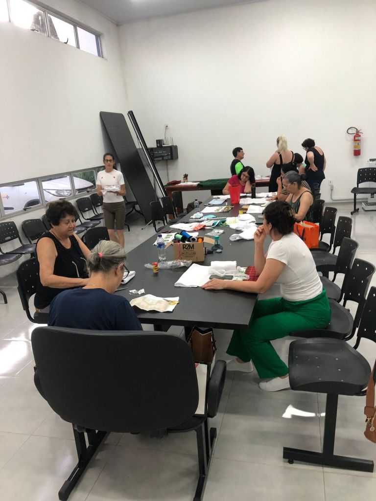 O grupo Psicoterapia 2 finalizou a produção das toalhas de rosto, concluindo a etapa de aplicação de acabamento e encerrando o trabalho iniciado nos encontros anteriores.