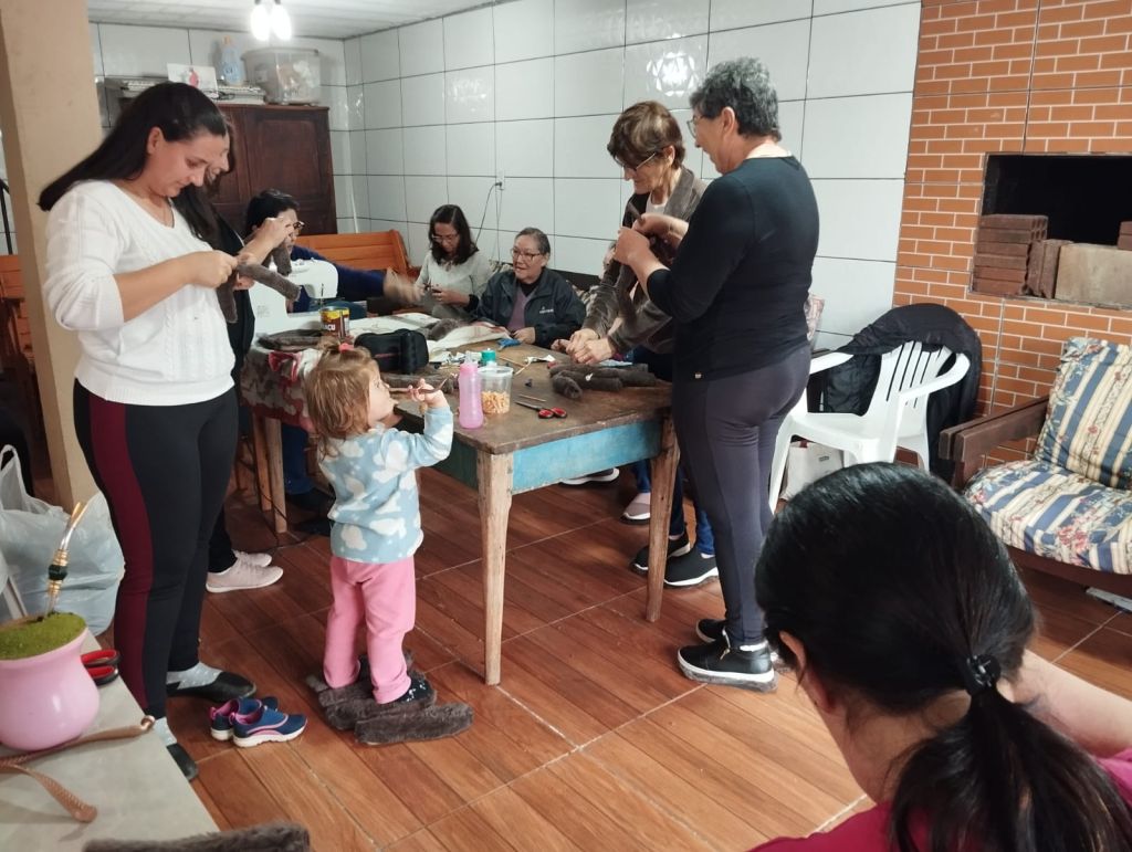 Na tarde de terça-feira, 19, o grupo do NAAB esteve na comunidade de Marmeleiro, onde a oficineira Cleonice Villani, com coordenação da psicóloga Tábata Darui, conduziu a atividade de confecção de chinelufas, chinelos de dedo peluciados, através da colagem de tecido sobre os calçados.