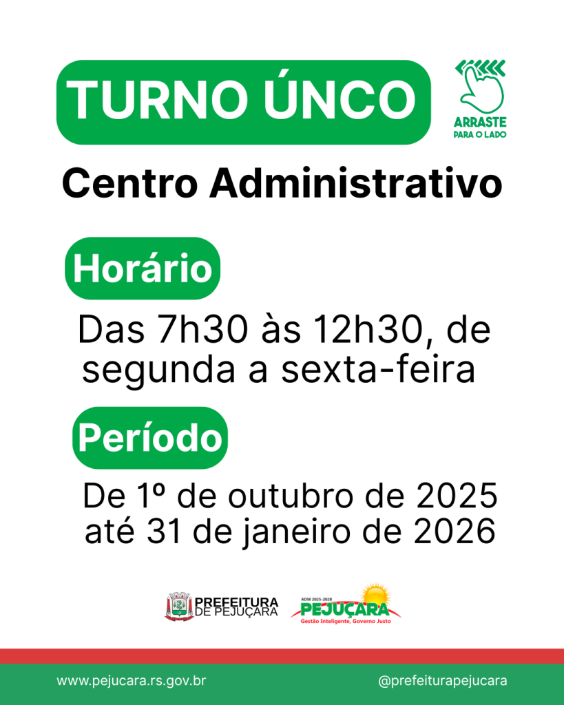 A partir de 1º de outubro de 2025, a Administração Municipal de Pejuçara passará a atender em turno único, com horário de expediente das 7h30 às 12h30, de segunda a sexta-feira.