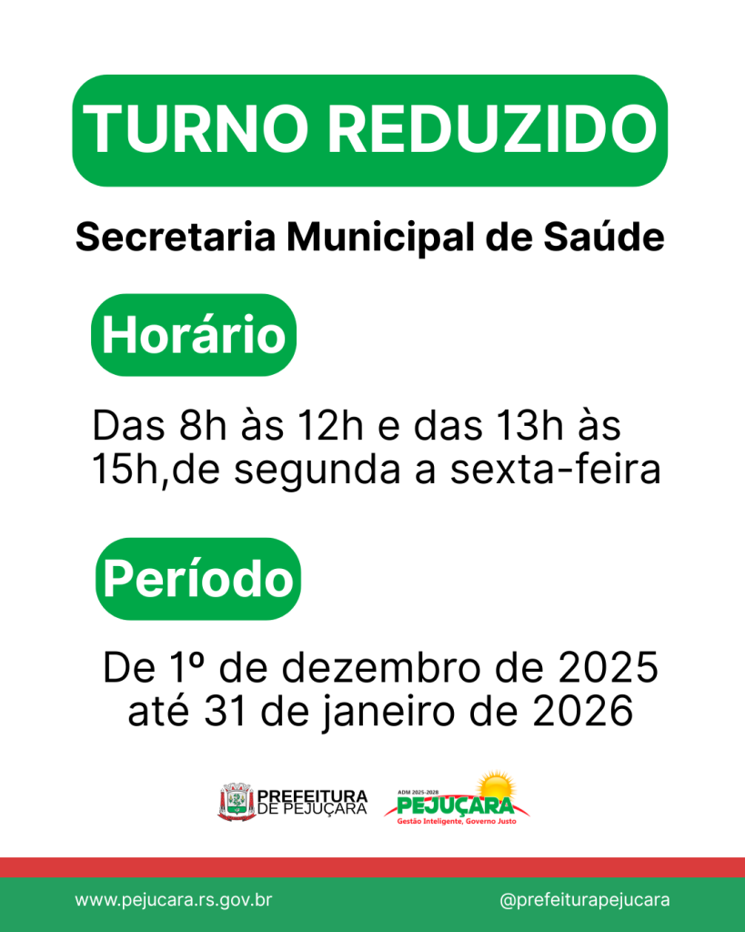 A Secretaria Municipal de Saúde passará a atender em turno reduzido a partir do dia 1º de dezembro de 2025, com funcionamento das 8h às 12h e das 13h às 15h.